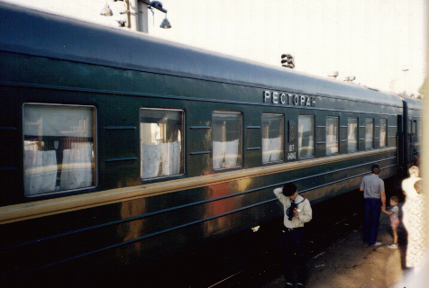 シベリア鉄道の車両です。レストランの車両を撮影してみました。メニューは一応あるのですが頼めるのはひとつだけ。なぜかバイカル湖を過ぎると魚料理が増えます。 |