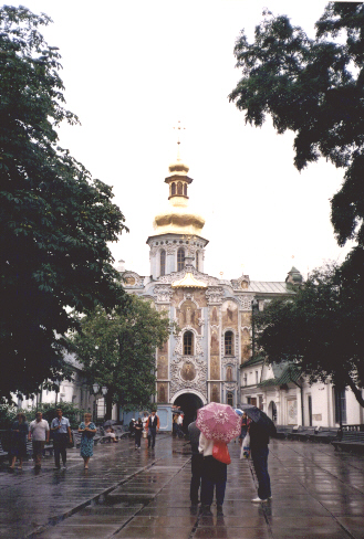 キエフの寺院。キエフではいきなり予約しいたホテルが勝手に変えられていてひどい目にあいました。でもよりよいホテルだったので一応好意だったのかも。 |