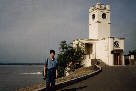 新潟から出発し最初の目的地ハバロフスクにて。後ろはアムール川です。川か海かよくわからないほどの広さです。 |