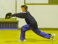 少し余裕があるが、完全に正面に入ることができない場合、一歩早めに減速して逆シングルで捕球すると素早く安定して送球体勢に入ることができます。ギリギリの打球の時と、右足と左足の位置関係が逆になっています。そのことによって、安定した姿勢でスローイングにつなげることができます。参照 無理に正面に入ろうとして、下の写真のような体勢になると、捕球が不安定になり、送球時にバランスを崩しやすくなりますので、注意しましょう。参照